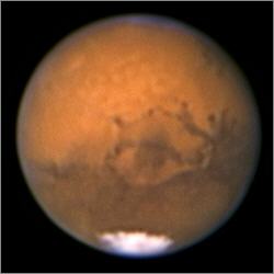 Wegen seiner orange- bis blutroten Farbe wurde er nach dem römischen Kriegsgott Mars benannt und wird oft auch als der Rote Planet bezeichnet. Diese Färbung geht auf Eisen(III)-oxid-Staub (Rost) zurück, der sich auf der Oberfläche und in der Atmosphäre verteilt hat. |