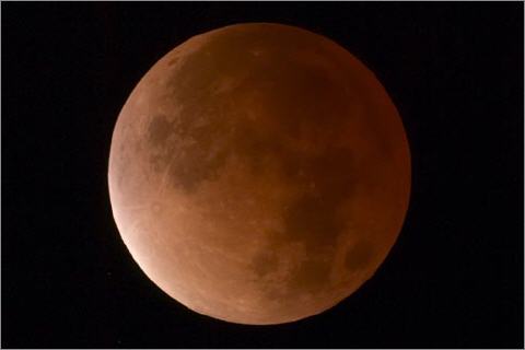 Die totale Mondfinsternis, bei welcher der Mond völlig in den Schatten der Erde wandert. Die Totalität dauert höchstens 100 Minuten. Betrachtet man die geometrischen Verhältnisse bei einer totalen Mondfinsternis, so sollte der Mond im Kernschatten der Erde liegen, der sich theoretisch knapp 1,4 Millionen Kilometer in den Raum erstrecken sollte, tatsächlich aber wegen der starken Streuung durch die Erdatmosphäre nur etwa 250.000 km weit reicht. Der Mond wird deshalb auch bei totalen Finsternissen nicht völlig verdunkelt. Da die Erdatmosphäre die blauen Anteile des Sonnenlichts stärker streut als die roten, erscheint der Mond bei totalen Finsternissen als dunkle rotbraune Scheibe; daher auch die gelegentliche Bezeichnung „Blutmond“.